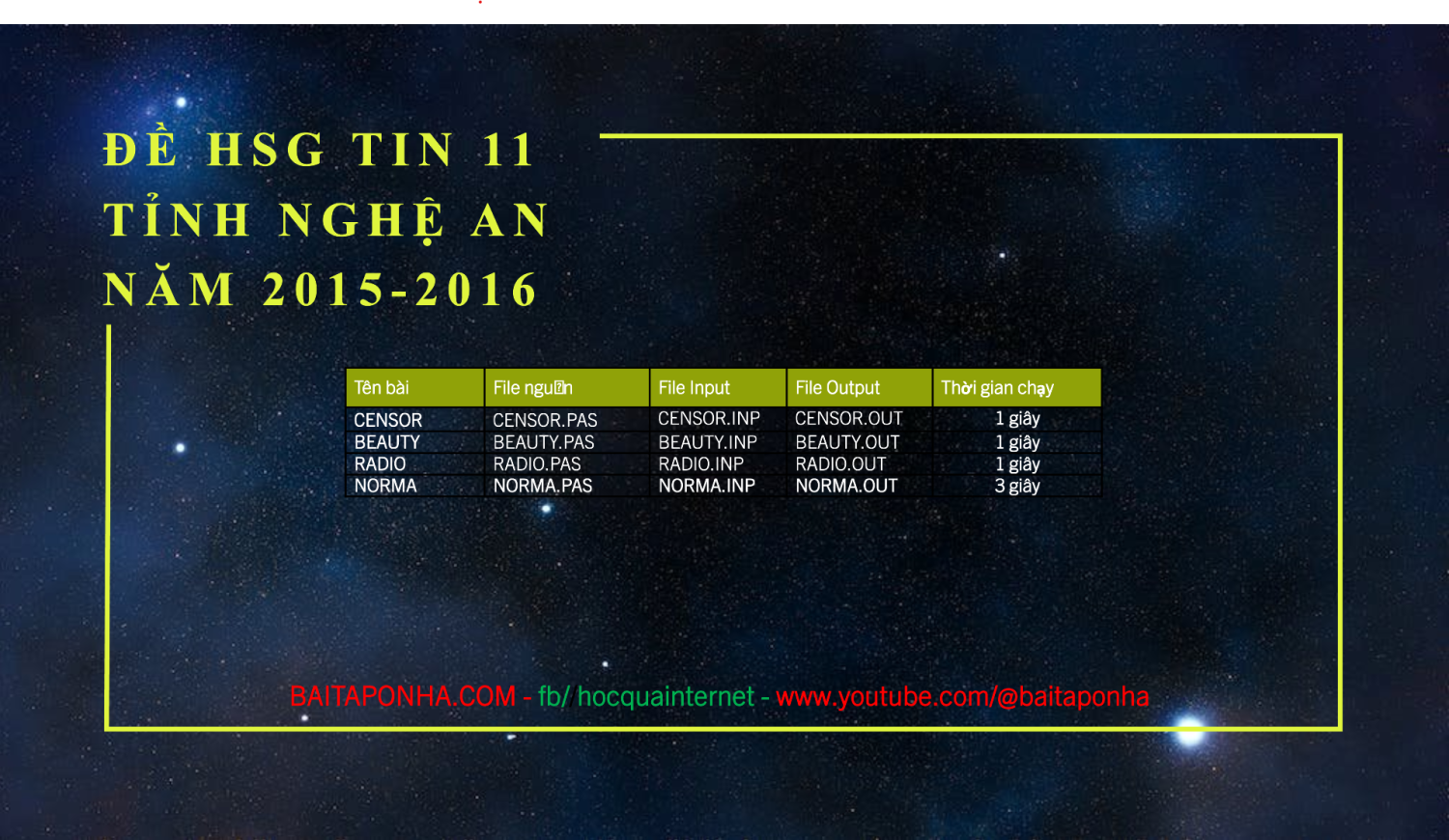 Gửi các bạn đề thi học sinh giỏi tỉnh môn tin học 11 của tỉnh Nghệ An năm học 2015 - 2016. Trong năm học này, Sở Giáo Dục Nghệ An chỉ cho phép thi bằng ngôn ngữ lập trình Pascal. Cũng như thường lệ, đề thi năm này có 4 câu, được sắp xếp theo thứ tự từ dễ đến khó. Điều đặc biệt trong đề này có một câu cho phép giới hạn chạy là 3s. Mới các bạn thử sức giải đề trước, các lời giải thì admin sẽ cập nhật sau.